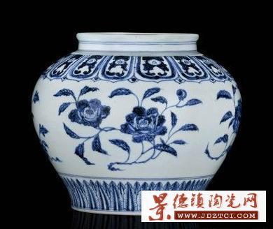 此罐是明代瓷器裝飾風(fēng)格的典范。一改元青花的繁密華縟而代之以疏朗清秀,纏枝花卉于蓮瓣紋予人一種高雅大方的美感。紋飾與優(yōu)美的罐體相襯,愈顯宮廷 奢華之氣,展示了景德鎮(zhèn)官窯匠師非凡的藝術(shù)才華。整器用進(jìn)口的“蘇麻離青”料繪制,筆法活潑流暢,線條粗細(xì)并用,彩料濃淡兼施。且不論著色深淺,紋飾效果 皆極為絢麗鮮艷、清新明快。在線條的紋理中布滿鈷鐵的結(jié)晶斑點(diǎn),呈星狀點(diǎn)滴暈散,彩料濃重處則凝聚成黑青色結(jié)晶斑。正因?yàn)榍嗔洗艘惶匦,令?huà)面富于水墨畫(huà) 般揮灑淋漓、蒼翠欲滴的意趣。所形成的此種藝術(shù)效果,“蘇麻離青”料固然是一方面原因,但更主要的還是匠師自身所具備的藝術(shù)修養(yǎng)與繪制技巧。每組花卉的形 態(tài)均系以極富中國(guó)畫(huà)傳統(tǒng)筆墨意韻之勾、勒、點(diǎn)、染等技法繪就,畫(huà)筆細(xì)膩傳神,表現(xiàn)出枝葉的翻轉(zhuǎn)扭曲、偃仰起伏之態(tài);花、枝、葉間的疏密聚散同樣是借鑒了國(guó) 畫(huà)的結(jié)構(gòu)布局,得其法度,極富寫(xiě)實(shí)效果,充分體現(xiàn)了匠師扎實(shí)深厚的筆墨功底;疏密有致的鋪排在視覺(jué)上亦形成了張弛有度的藝術(shù)效果。