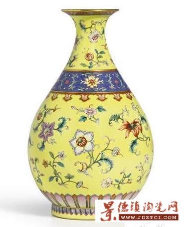 《黃地洋彩軋道錦地折枝洋花玉壺春瓶》 請(qǐng)乾隆年間 尺寸:29.3cm 成交價(jià):29.3cmHKD;45,276,840RMB