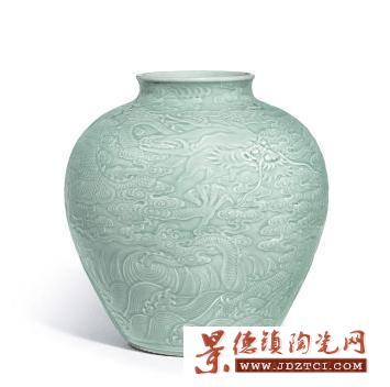 NO.6、清乾隆《粉青釉浮雕“蒼龍教子”圖罐》成交價(jià):74,512,200元,刷新了單色釉拍賣紀(jì)錄。