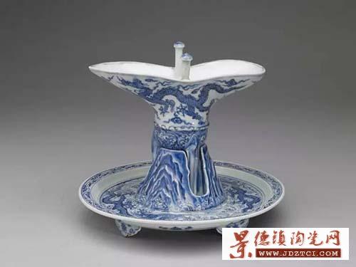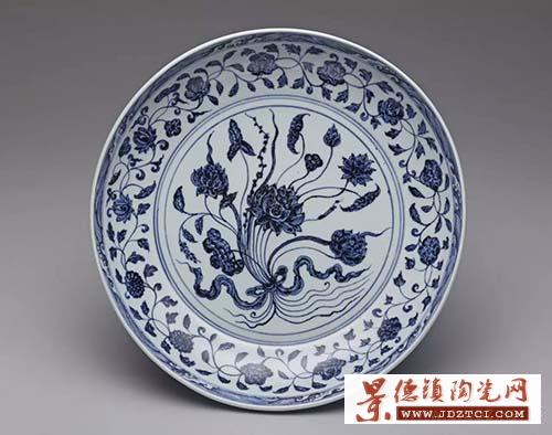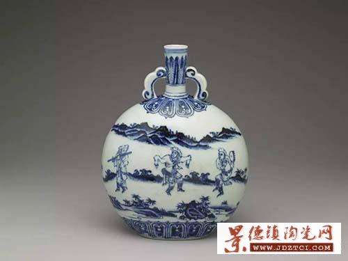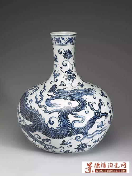 在朝廷的要求和監(jiān)督下,瓷器先由內府“定奪樣制”,才發(fā)給窯廠照樣制作。官用作品器形規(guī)整、釉色純正、紋飾合于規(guī)范的現(xiàn)象在此時開始建立。不合標準的作品往往被刻意擊碎,掩藏起來,燒成的瓷器則作為國家禮儀或宮廷日常之用,或成為賞藩外交邦國的禮物。永樂、宣德年間,常有大型器如天球瓶、扁壺等作品的燒制。