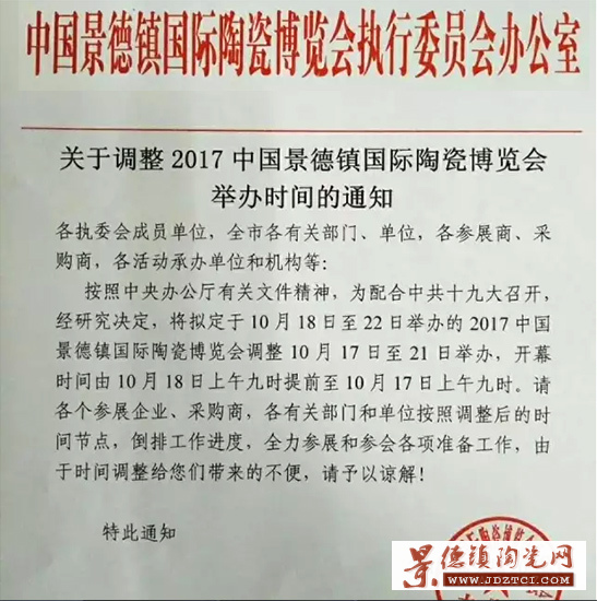 9月20日記者從瓷博會(huì)執(zhí)委辦獲悉,為配合中共十九大召開,將擬定于10月18至22日舉辦的2017中國景德鎮(zhèn)國際陶瓷博覽會(huì)調(diào)整為10月17日至21日舉辦,開幕時(shí)間由10月18日上午九時(shí)提前至10月17日上午九時(shí)。