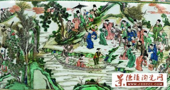此原為洛陽橋故事中觀音巧取金銀以助蔡學(xué)士一節(jié)。畫面中蔡襄攜仆騎馬從山后而出,山前場地頗開闊,人群熙熙攘攘擠在江邊,即有豪紳鄉(xiāng)賢,又有市井民夫、乞丐走卒,皆是手持金銀元寶,或做欲投擲之態(tài),或正取金銀之姿,又有多人交頭接耳,熱鬧非凡。江中有花船一只,上有一老船夫掌篙,一紅衣妙女坐于船中,旁立一黃衣綠褂者,似為侍女。船中灑滿了從江岸上投來的金銀。人群外,呂祖攜樹精隱觀,或架云浮在空中,或藏身出在山后。用彩用色熱烈鮮亮,繪畫毫發(fā)爽利,構(gòu)圖奇幻富麗,應(yīng)屬同時期的康熙五彩上等細(xì)作。