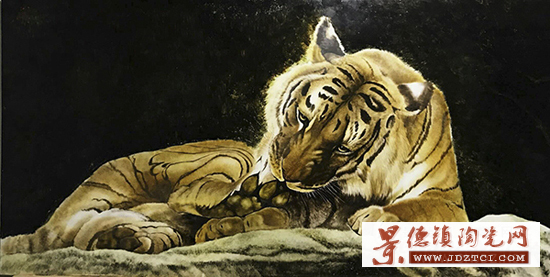 靜窩在石頭上沉思的老虎,似乎是要被黑色的背景給吸進去,又像是從黑色中走出來,黃與黑的對照,明與暗的對比,在這里是如此的和諧。