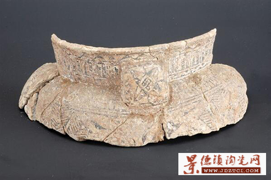像這件彩陶罐一樣,南托大塘遺址中還出土了許多刻有復(fù)雜陶符與圖案的陶器。在一件圈足陶碗底部,有一組神人獸面紋飾,這或許就是大塘氏族的族徽吧。這件器物呈圓形,缺失嚴(yán)重,在底部中央有一處戳記,圖案呈長(zhǎng)方形,似一獸面,張口伸舌,上下各伸出兩顆交錯(cuò)的獠牙,頂部有三根線條伸出,是為“冠”,獸面兩側(cè)各有兩組對(duì)峙的翼狀物伸出,造型對(duì)稱,結(jié)構(gòu)穩(wěn)定,布局合理。
