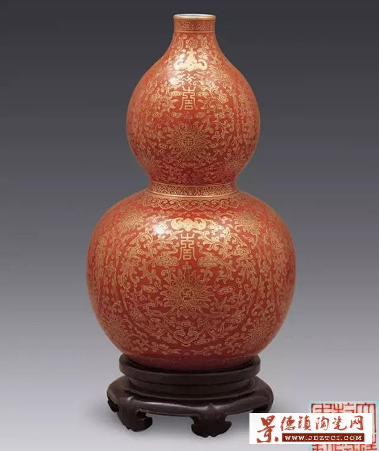 珊瑚紅也是一種低溫鐵紅釉,始于康熙,盛于雍、乾兩朝。燒成后釉色均勻、光潤,能與天然珊瑚媲美,故名“珊瑚紅”。乾隆時多在珊瑚紅上描金,或用它來裝飾器耳。但仍以珊瑚紅器物為貴。