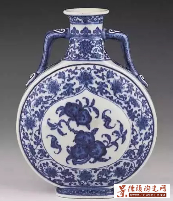 亦稱(chēng)“抱月瓶”。小口、直頸,頸側(cè)雙耳,因瓶腹似圓月,故名。明代永樂(lè)、宣德景德鎮(zhèn)窯常見(jiàn)器物之一,清代雍正、乾隆仿制,多為青花。