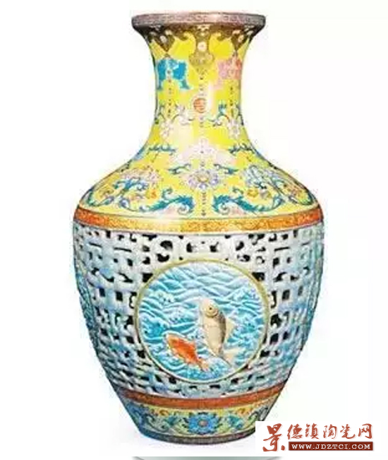 外瓶腹際鏤孔,腹內(nèi)套裝一個(gè)可以轉(zhuǎn)動(dòng)的內(nèi)瓶,撥動(dòng)上瓶瓶口,內(nèi)瓶即轉(zhuǎn)動(dòng),故稱(chēng)轉(zhuǎn)心瓶。清代乾隆景德鎮(zhèn)窯創(chuàng)制,多為官窯器。