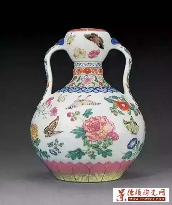 這是葫蘆瓶的變種,瓶身還是葫蘆,但加了如意形的耳,故名如意耳。尊是瓶的一種,古書(shū)上說(shuō)“口足相仿者為尊” “口大者為尊,口小者為瓶”,其實(shí)界限很模糊,比如琵琶尊也可叫琵琶瓶。