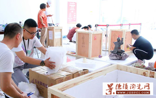 據(jù)拆件驗(yàn)收組的工作人員劉建東介紹,全國美展陶藝展收到的入選復(fù)評作品,每一件都要專門打開檢驗(yàn),如有破損會及時(shí)聯(lián)系作者進(jìn)行修復(fù)。需要修復(fù)的作品放在庫房里,外地參賽作者來景進(jìn)行修復(fù)時(shí),又要從庫房重新搬出來,來來回回,要拆裝幾次。正常拆一件包裝好的參賽作品需要20分鐘左右。很多大件的陶瓷作品因體積重量因素不能搬到現(xiàn)場拆件區(qū)的,只能存放在庫房里,工作人員必須冒著高溫進(jìn)行拆件作業(yè),拆好后還需進(jìn)行復(fù)原包裝,工作強(qiáng)度非常之大,拆件組的工作人員每天早上8點(diǎn)開始工作,一直工作到晚上11點(diǎn)。