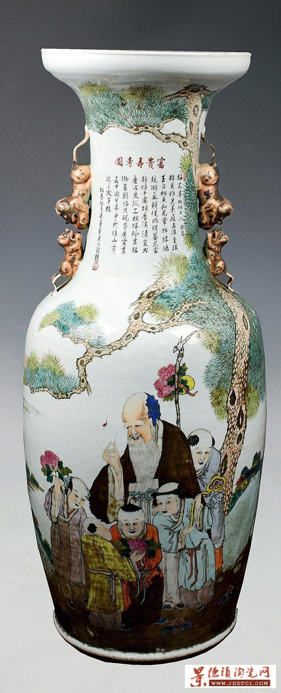 除了御窯廠眾多的畫(huà)師和圍繞著景德鎮(zhèn)陶瓷產(chǎn)業(yè)的大小紅店及作坊中的畫(huà)匠外,尚有不少成名的書(shū)畫(huà)家客串繪制淺絳彩瓷。如:在梁基永編著的《中國(guó)淺絳彩瓷》中就錄有海派畫(huà)家張熊(子祥)《四清圖》瓷板一塊,清末金石篆刻家黃士陵《松壽圖》四方帽筒一件。這些名噪一時(shí)的畫(huà)家的加入,間接地對(duì)淺絳彩瓷的發(fā)展起到了推波助瀾的作用。