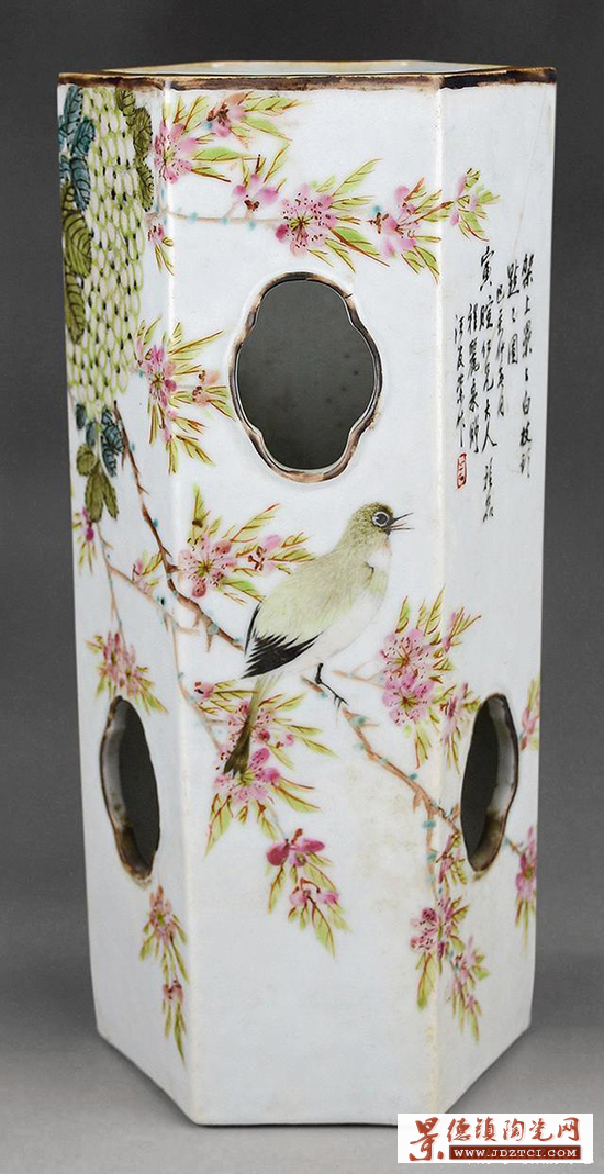 圖11 汪友棠淺絳花鳥(niǎo)紋六方鏤空帽筒