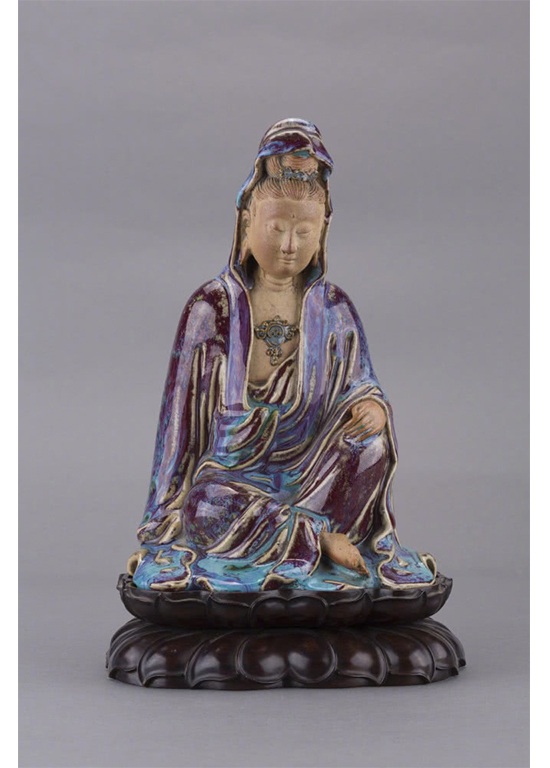 這件就是馬未都馬爺收藏的一尊雍正年間的觀音瓷塑,這件瓷塑據(jù)馬未都在收藏馬未都節(jié)目當(dāng)中的介紹,我們可以得知,這件觀音瓷塑身披窯變,而恰恰就是這個(gè)窯變讓這尊觀音增加了神秘感,這是雍正時(shí)期的窯變,這個(gè)時(shí)期的窯變從顏色到觀音的姿態(tài),讓人感受到一種富麗堂皇的感覺,窯變呈現(xiàn)出一種紅藍(lán)相間的抽象對(duì)比色,觀之讓人很快進(jìn)入一種奇幻的世界,馬未都在節(jié)目中透露,紅藍(lán)相間是雍正年間窯變瓷器的標(biāo)準(zhǔn)的鑒定方法,馬爺直言清代早期的佛造像有當(dāng)年宋金時(shí)期的味道,面部比較豐滿并且比較鼓,眉毛和眼睛之間比較緊湊,表情像是在思考,此尊觀音整體感覺非常安靜,身體也非常放松,衣著也非常松弛,馬爺這件觀音瓷塑表達(dá)了自在觀音的基本形態(tài),馬爺還拿出了一個(gè)手電,按照一個(gè)有規(guī)律的軌跡從不同的角度照射觀音時(shí),發(fā)現(xiàn)觀音的面部出現(xiàn)了不同的變化,由沉穆變成笑意滿臉,觀眾看后恍然大悟,十分神奇。