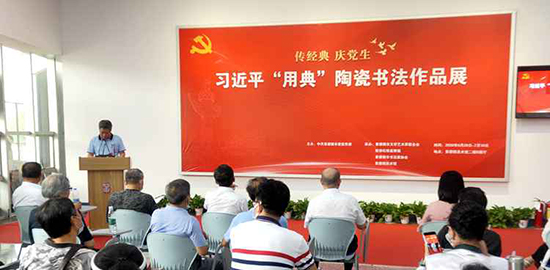 市文聯(lián)負責(zé)人在致辭中表示,這是一場思想和藝術(shù)完美結(jié)合的高層次展覽,是對習(xí)近平“用典”名句的藝術(shù)呈現(xiàn),傳遞了黨的聲音和社會的正能量,對于我們學(xué)習(xí)領(lǐng)會習(xí)近平新時代中國特色社會主義思想,增強文化自信和使命擔(dān)當(dāng),不斷推動社會主義文化繁榮興盛,具有十分重要的意義;這是一場書法與陶瓷深度融合的高層次展覽,不僅讓收藏在博物館里的文物、陳列在廣闊大地上的遺產(chǎn)、書寫在古籍里的文字都“活”了起來,更有力地宣傳、推廣和弘揚了陶瓷書法的無窮魅力,是在用陶瓷講好中國故事,傳遞著中國聲音。希望通過這場展覽,讓我們在學(xué)習(xí)習(xí)近平總書記用典中,進一步深入領(lǐng)會其中精神和思想精髓,從中汲取中華優(yōu)秀傳統(tǒng)文化豐富營養(yǎng),提升自身的素質(zhì);推動全社會對傳承傳統(tǒng)文化的關(guān)注,更好地傳承中華優(yōu)秀傳統(tǒng)文化,踐行社會主義核心價值觀,增強民族認(rèn)同感和使命感;帶動廣大文藝家和文藝工作者們自覺地融入創(chuàng)作中,投身到景德鎮(zhèn)國家陶瓷文化傳承創(chuàng)新試驗區(qū)建設(shè)中,扛起肩負的使命和擔(dān)當(dāng)。
