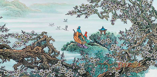 趙惠民先生的《中國百花仙女》彩盤,其中一幅以梅花神壽陽公主為主圖案,披紅裘,執(zhí)枝條,左側(cè)一株梅莖,紅蕊紛綻,右側(cè)幾莖梅枝旁逸而出,兩只白羽丹頂鶴一昂立一蹲伏。整個畫面云霧繚繞,去盡煙火氣,宛若仙境。