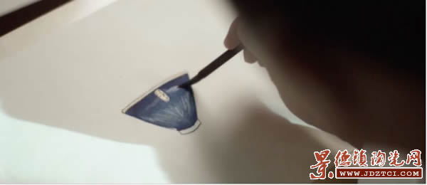 制作“翠羽星藍(lán)杯”需要吹兩種釉。第一次吹釉的時(shí)候,需要根據(jù)器皿的走向,先在外部由下往上吹釉,再施內(nèi)釉。吹釉過(guò)程中形成的顆粒會(huì)成為一個(gè)凝固層,這樣一層一層地吹釉,會(huì)在坯體上形成一個(gè)夾層。