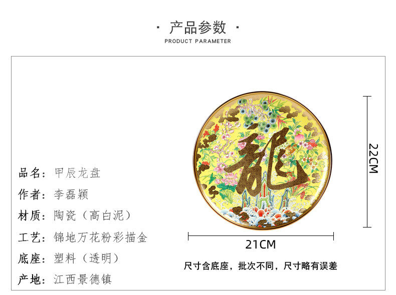 甲辰龍盤是錦地萬(wàn)花十二生肖系列粉彩瓷盤推出的收藏級(jí)瓷盤,由首屆中國(guó)陶瓷設(shè)計(jì)藝術(shù)大師劉少平先生創(chuàng)意并監(jiān)制,由景德鎮(zhèn)陶瓷大學(xué)李磊穎教授執(zhí)筆創(chuàng)作設(shè)計(jì),甲辰龍盤以景德鎮(zhèn)傳統(tǒng)的粉彩錦地萬(wàn)花作地,以皇家色彩金黃色為基調(diào),萬(wàn)花圖案選取“海水江崖”、“福壽三多”“富貴牡丹”、“松竹梅”、“云邊如意”等紋飾,烘托出富有立體感的主體“龍”字,浮雕金龍字撫擷取自三希堂法貼中宋代蘇軾手書字體。紋飾和書法組合在一起,營(yíng)造出充盈的富貴感,寓意江山萬(wàn)代、山海福壽、幸福長(zhǎng)存等美好象征意義。
