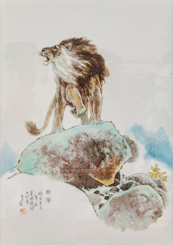 中國工藝美術(shù)大師李進的瓷板畫《雄風(fēng)》,以一只傲立于山石之上的雄獅為主體,前足微收,鬃毛飛揚,目光如炬,展現(xiàn)出一種內(nèi)斂而磅礴的力量感。作品構(gòu)圖精妙,設(shè)色清雅,既延續(xù)了中國傳統(tǒng)繪畫的寫意精神,又融入了現(xiàn)代審美意識,使雄獅這一經(jīng)典意象煥發(fā)出新的藝術(shù)生命力。