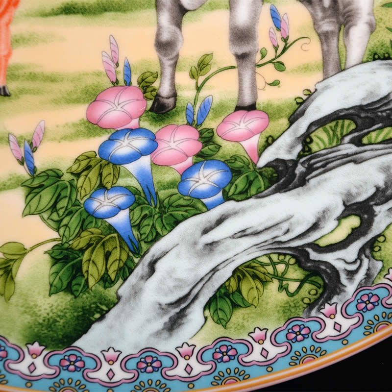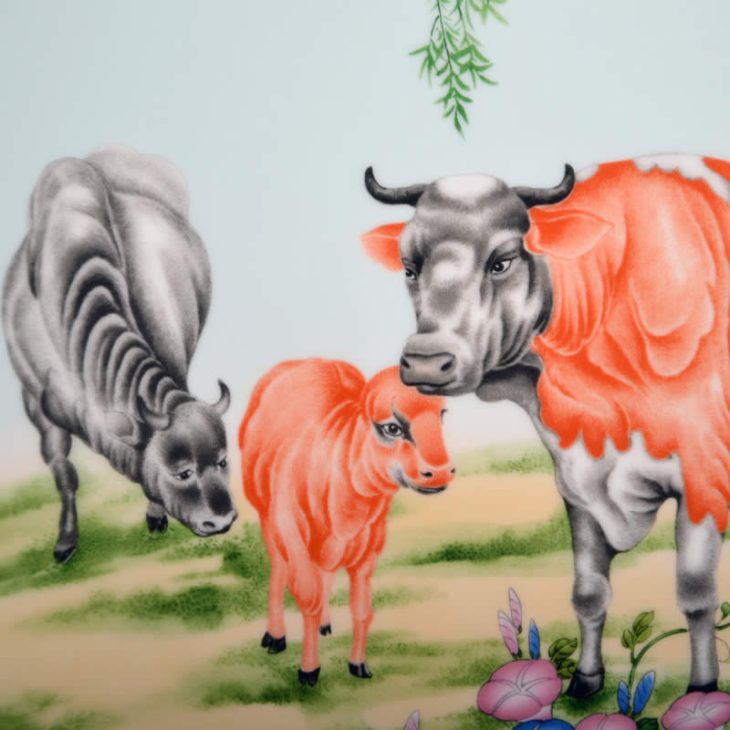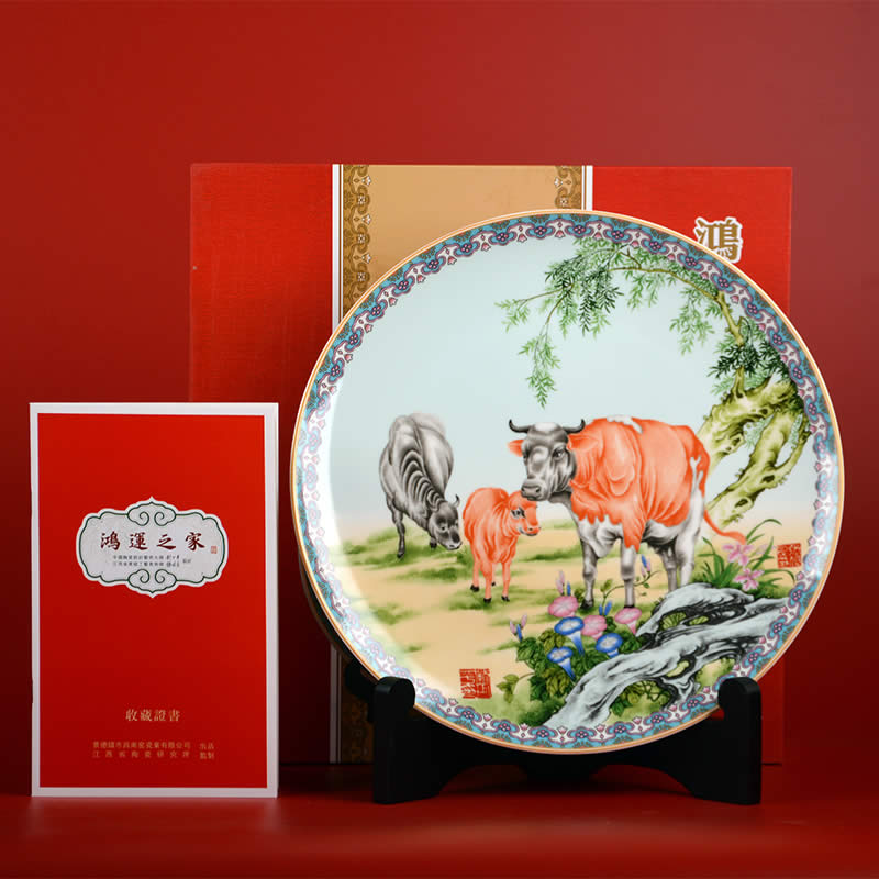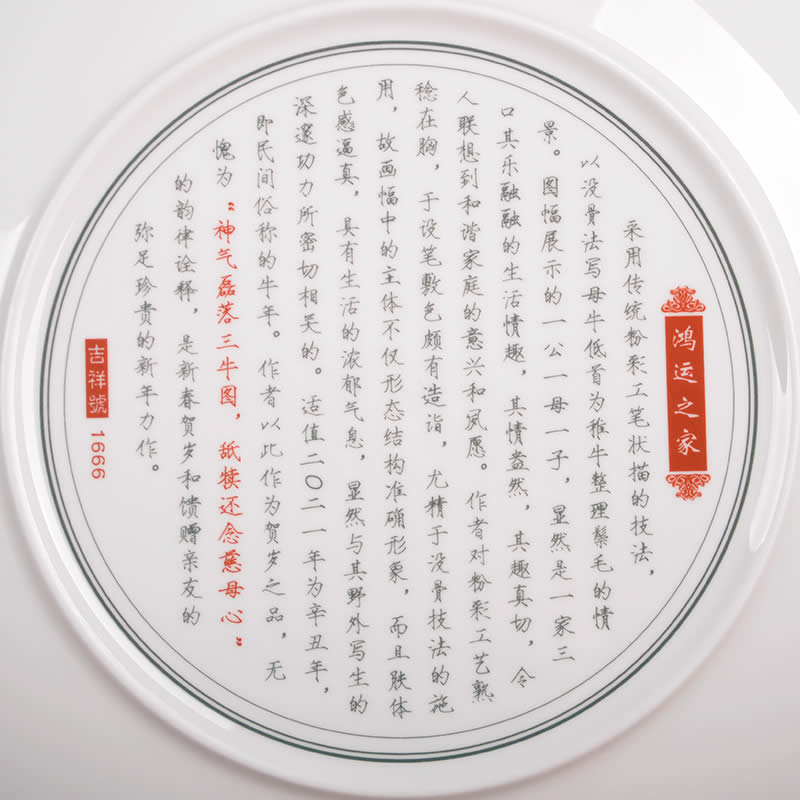 《鴻運之家》瓷盤由中國陶瓷設計藝術大師劉少平先生和張俊良先生聯(lián)袂創(chuàng)作的生肖系列彩盤之一,生肖牛紀念瓷由江西省陶瓷研究所監(jiān)制限量生產(chǎn)。 《鴻運之家》采用傳統(tǒng)粉彩工筆狀描的技法,以沒骨法寫母牛低首為稚牛整理鬃毛的情景。圖幅展示的犢牛一家,一公一母一子,顯然是一家三口其樂融融的生活情趣,其情盎然,其趣真切,令人聯(lián)想到和家庭的意興和夙愿。作者對粉彩工藝熟稔在胸,于設筆敷色頗有造詣,尤精于沒骨技法的施用,故畫幅中的主體不僅形態(tài)結構準確形象,而且膚體色感逼真,具有生活的濃郁氣息,顯然與其野外寫生的深邃功力所密切相關的。 時值二O二一年為辛丑年,即民間俗稱的牛年。作者以此作為之品無愧為“神氣磊落三牛圖,舐犢還念慈母心”的韻律詮釋,是新春賀歲和饋贈親友的彌足珍貴的新年力作。